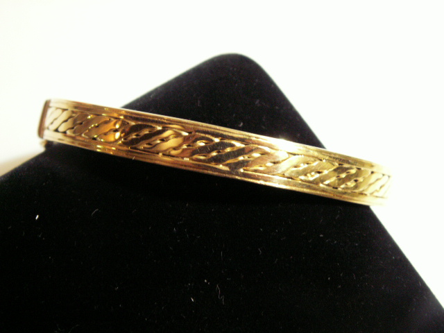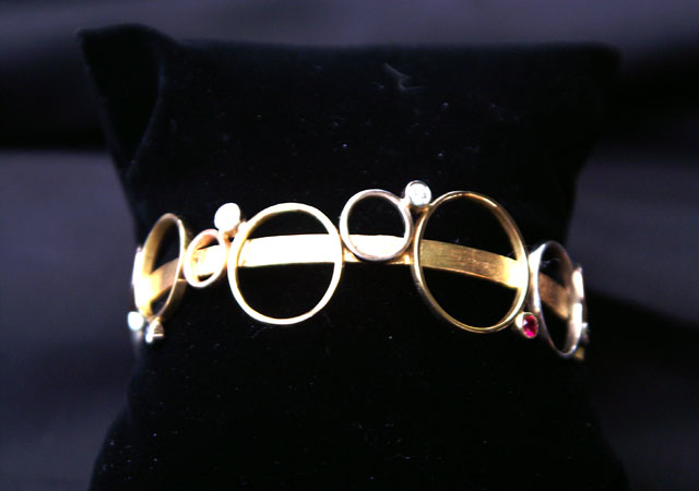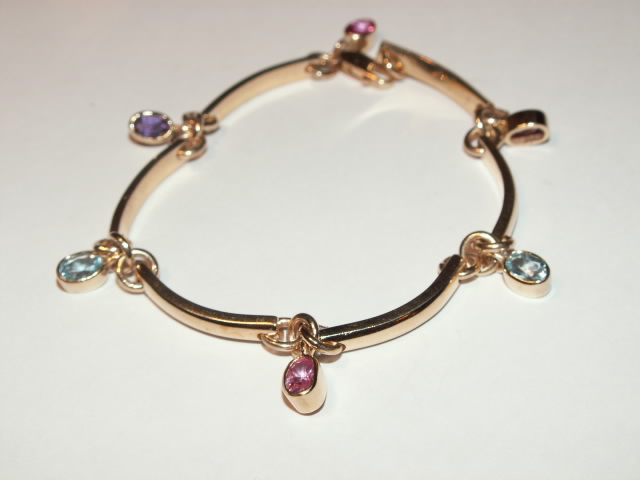| Pink Sapphire, Blue Topaz and Amethyst | Bangle set with semi precious Stones | Bracelet made from customers old gold | 18 ct yellow gold & copper lined bangle |